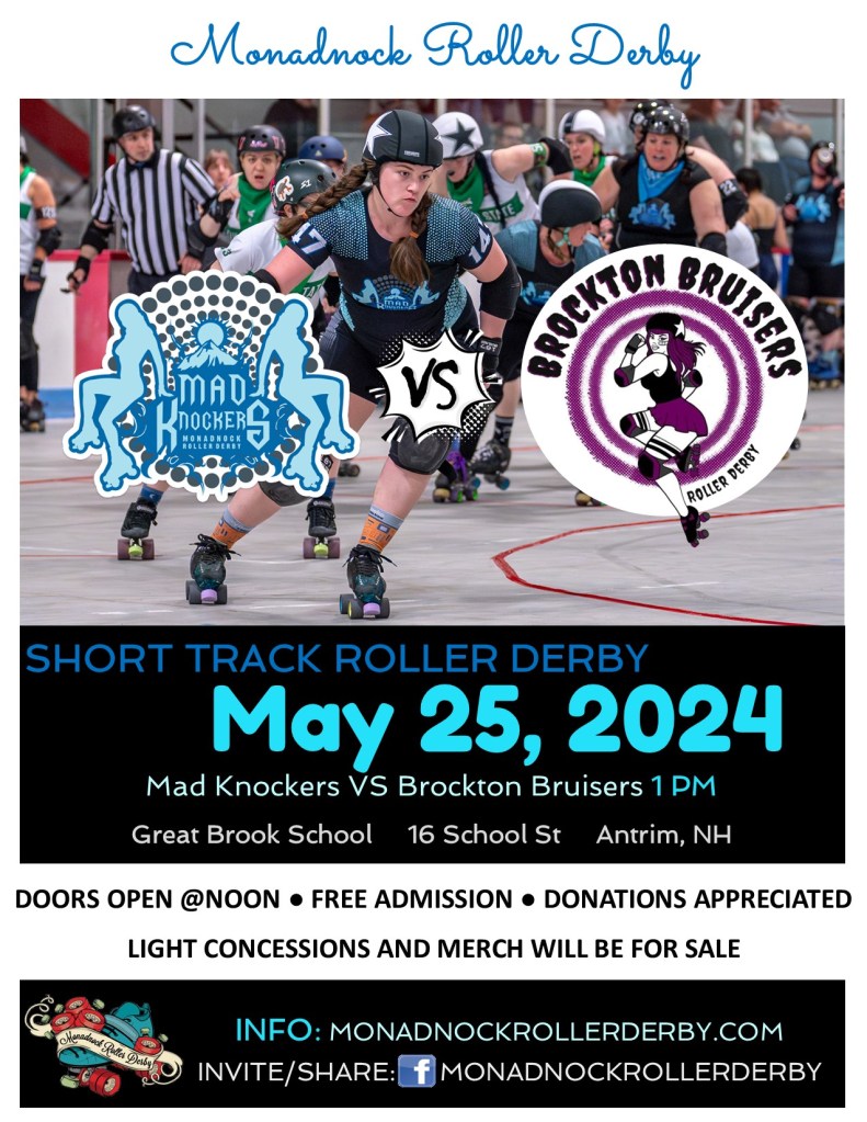 Come watch your local roller derby team in a new kind of roller derby! Short track roller derby is played with 2 blockers and 1 jammer from each team. Everyone has to jam, and there is no calling it off or serving time for penalties! It is fast paced and fun to watch! See the Mad Knockers take on the Brockton Bruisers! Doors open at noon. First whistle is at 1pm. FREE admission. Food and merch will be available for purchase.
