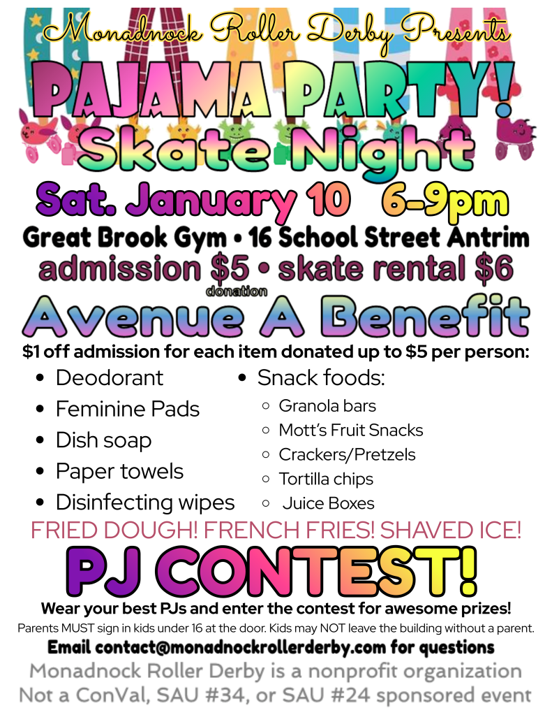 Pajama Party Skate Night! 27 Oct 202531 Dec 2025 by Monadnock Roller Derby Come to the next skate night! Pajama costume contest, and a fundraiser for Avenue A Teen Center in Antrim. Share this: Click to share on X (Opens in new window) X Click to share on Facebook (Opens in new window) Facebook Like Loading...