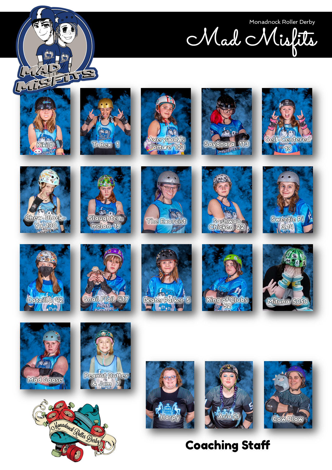 Monadnock Roller Derby’s Junior Team, The Mad Misfits, is open gender, ages 7-17. Junior roller derby doesn’t start out with hitting like the women, only blocking by position, but with all the fun, fitness, teamwork, confidence, and joy that roller derby is all about. We compete with other junior teams in New England and play by Junior Roller Derby Association (JRDA) rules. Juniors work through L1, L2, and L3 skills.