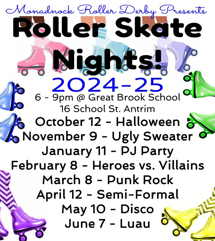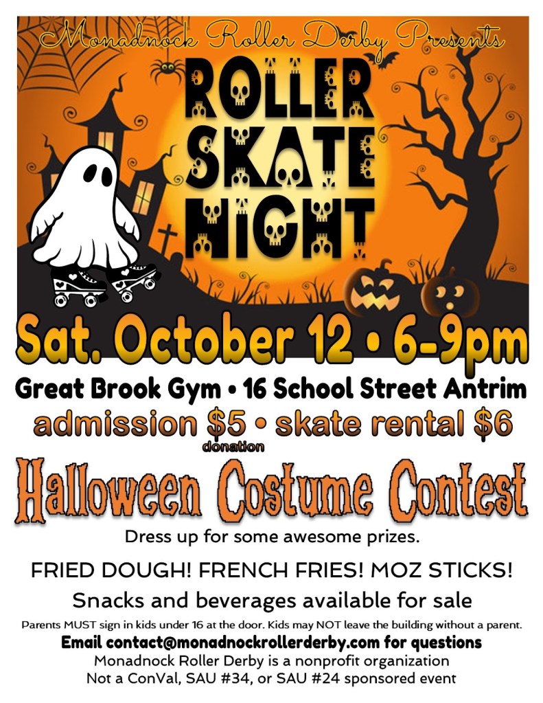 Come join us for the first skate night of the season! Halloween themed skate night with a costume contest! Great food, great skating, and great people. Come check out this family friendly event. Rental skates come in sizes 7 toddler to 15 men’s. Rentals only $6, admission $5 per person. Next skate night is in November. Have questions? Message us on Facebook or email contact@monadnockrollerderby.com
